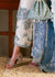 An ivory pure raw silk shirt embroidered in delicate threads of ivory and icy blue, accented with silver embellishments along the neckline, hem, and sleeves. Icy blue chanderi silk trims offer subtle contrast. Paired with matching culottes featuring intricate cutwork and a softly curved hem. The look is completed with a sheer organza dupatta in icy blue, finished with detailed floral embroidery and cutwork edging on all four sides.